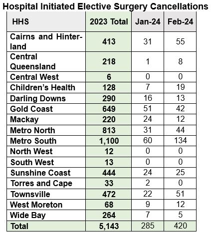 The health statistics obtained by the LNP Opposition via a Parliamentary Question on Notice also revealed 705 surgeries were also cancelled in the first two months of this year.